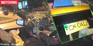 HAVE you ever seen such an unusual taxi? Lovell Tan never has. The user on popular citizen journalism website Stomp came across this taxi which, on the inside, was decorated with obituary photos, toys and figurines. Apparently she was with her friend when she stumbled onto this taxi in Choa Chu Kang, an area that is not short on cemeteries. According to the National Environment Agency website, Choa Chua Kang Cemetery is the only cemetery in Singapore still open for burials. She told Stomp: 'It was over-flowing with decorations - the front and back windows was filled with figurines, there was an amazing amount of written notes and stickers all over the taxi, and obituary photos were hanging from end to end. ''Even the car boot was filled with toys and figurines and photos of the dead.' As I was taking photos of the taxi, the driver came up to us and I asked him if we could take a photo of him with the taxi. He obliged. 'I wonder if anyone would dare to ride in his taxi. 'Those daring passengers might receive a discount on the fare as well we think - from the pictures the atmosphere of the cab looks chilly enough without turning on the air-con.Blood-stained body found at Bukit Batok church